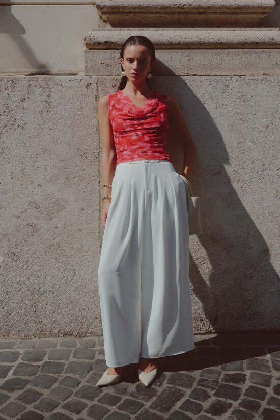 Blusa de talle medio, escote caída de agua, manga cero y detalles de pliegues en costado, Lleva forro.
